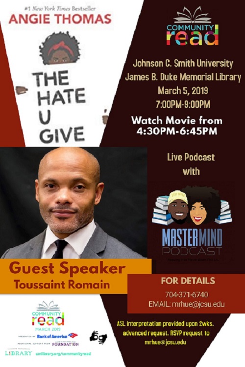 March 5, 2019: Johnson C. Smith University will host a book discussion and viewing of the movie, “The Hate You Give,” with a presentation by Toussaint Romain. The program will end with a Live Podcast with Mastermind Podcast to capture people’s comments and reactions to the book and movie. The movie and discussion will be held in the James B. Duke Memorial Library.