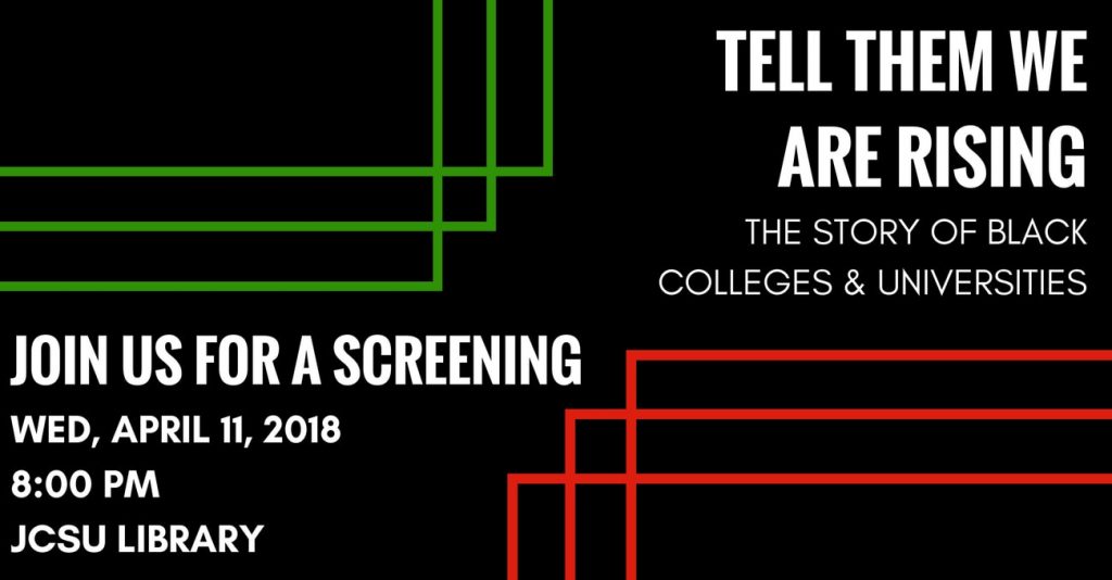 Join us for a screening of the documentary, Tell Them We Are Rising: The Story of Historically Black Colleges and Universities on Wednesday, April 11, 2018 at 8:00pm in the library. The documentary examines the impact of HBCUs on American history and culture.