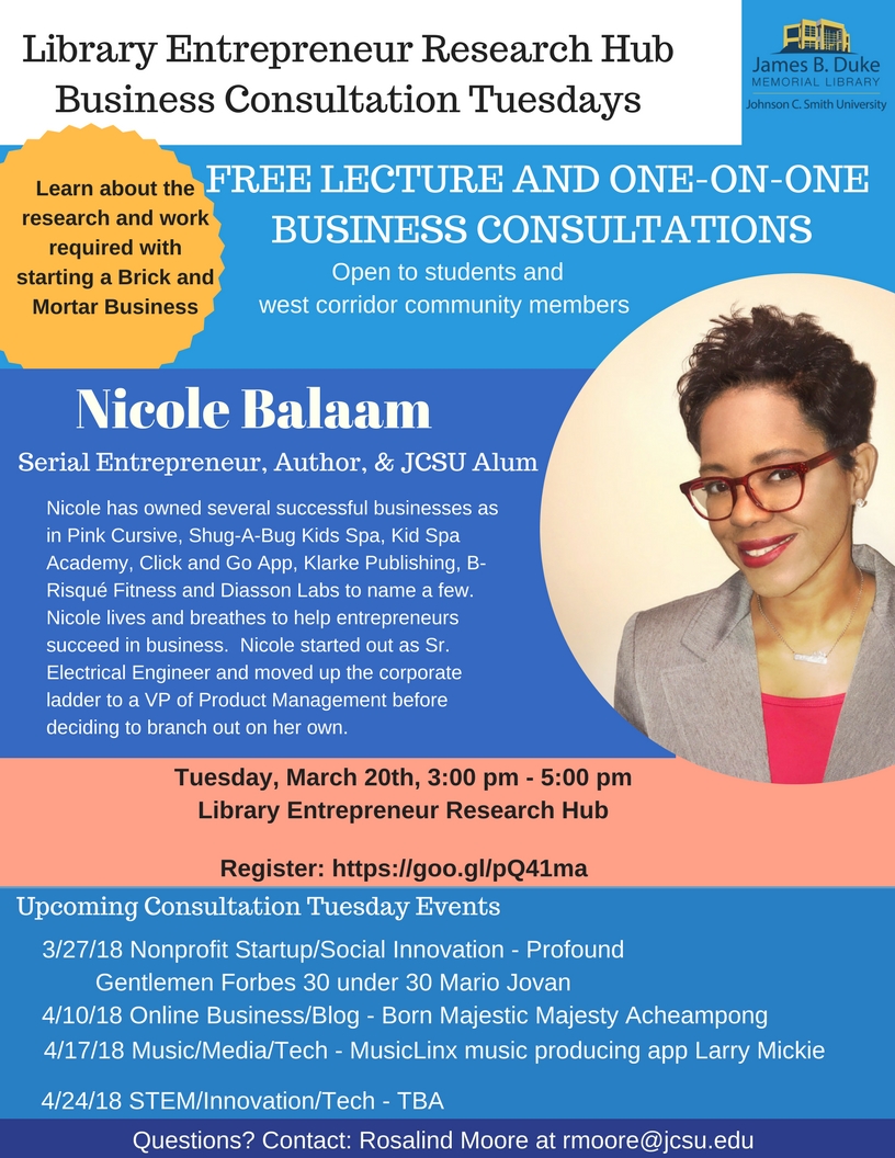 This session will be an introductory tour around entrepreneur website and library resources. The session will acquaint aspiring and established entrepreneurs with how to use the library and free web resources for business development. Open to JCSU students and West Charlotte community members. Register here! If you have any questions please contact Rosalind Moore by phone at…