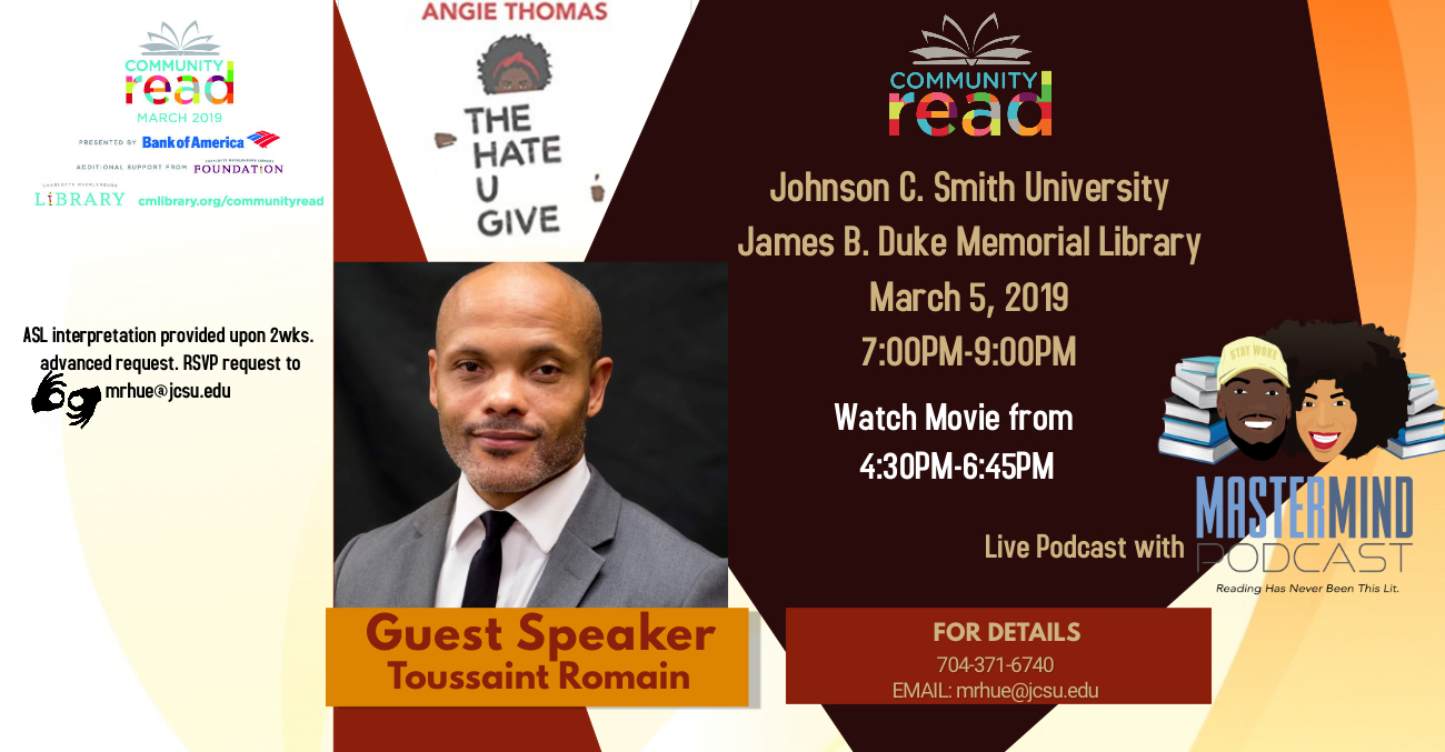 March 5, 2019: Johnson C. Smith University will host a book discussion and viewing of the movie, “The Hate You Give,” with a presentation by Toussaint Romain. The program will end with a Live Podcast with Mastermind Podcast to capture people’s comments and reactions to the book and movie. The movie and discussion will be held in the James…