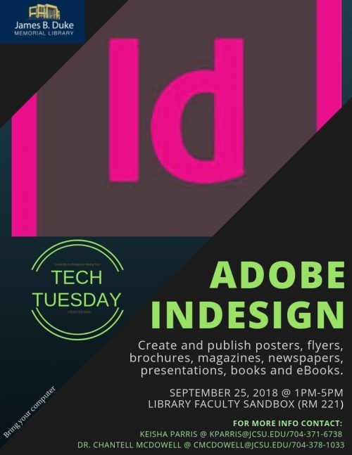 Join us for our first Tech Tuesday workshop of the 2018-2019 academic year. Come learn about Adobe InDesign and start creating and publishing posters, flyers, brochures, magazines, newspapers, presentations, books and more. Everyone is invited to attend. Bring your own computer. Register online at: FREE: ADOBE INDESIGN WORKSHOP For more information please contact: Keisha Parris at…