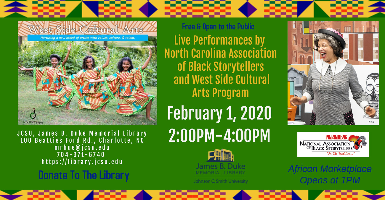 Live performances by North Carolina Association of Black Storytellers and West Side Cultural Arts Program. Sponsored by JCSU Collegiate Storytelling Association an affiliate of the National Association of Black Storytellers. African Marketplace opens at 1:00PM.