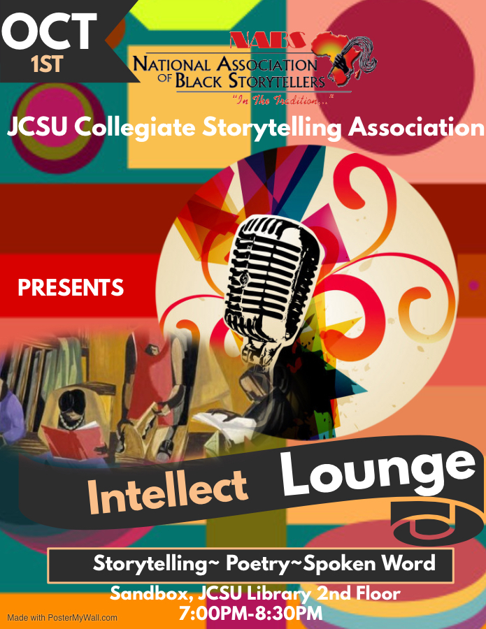 JCSU Collegiate Storytelling Association Presents... Intellect Lounge: Storytelling, Poetry, Spoken Words Sandbox, Library 2nd floor For more information email jcsublackstorytelling@gmail.com