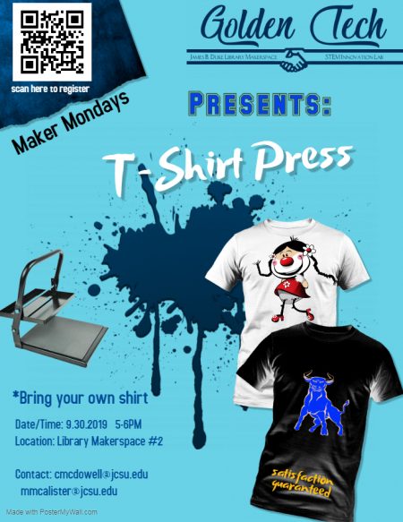 Bring your own shirt. The workshop will be in the makerspace area on the first floor of the library. For more information contact Dr. Chantell McDowell at: cmcdowell@jcsu.edu OR 704-378-1033