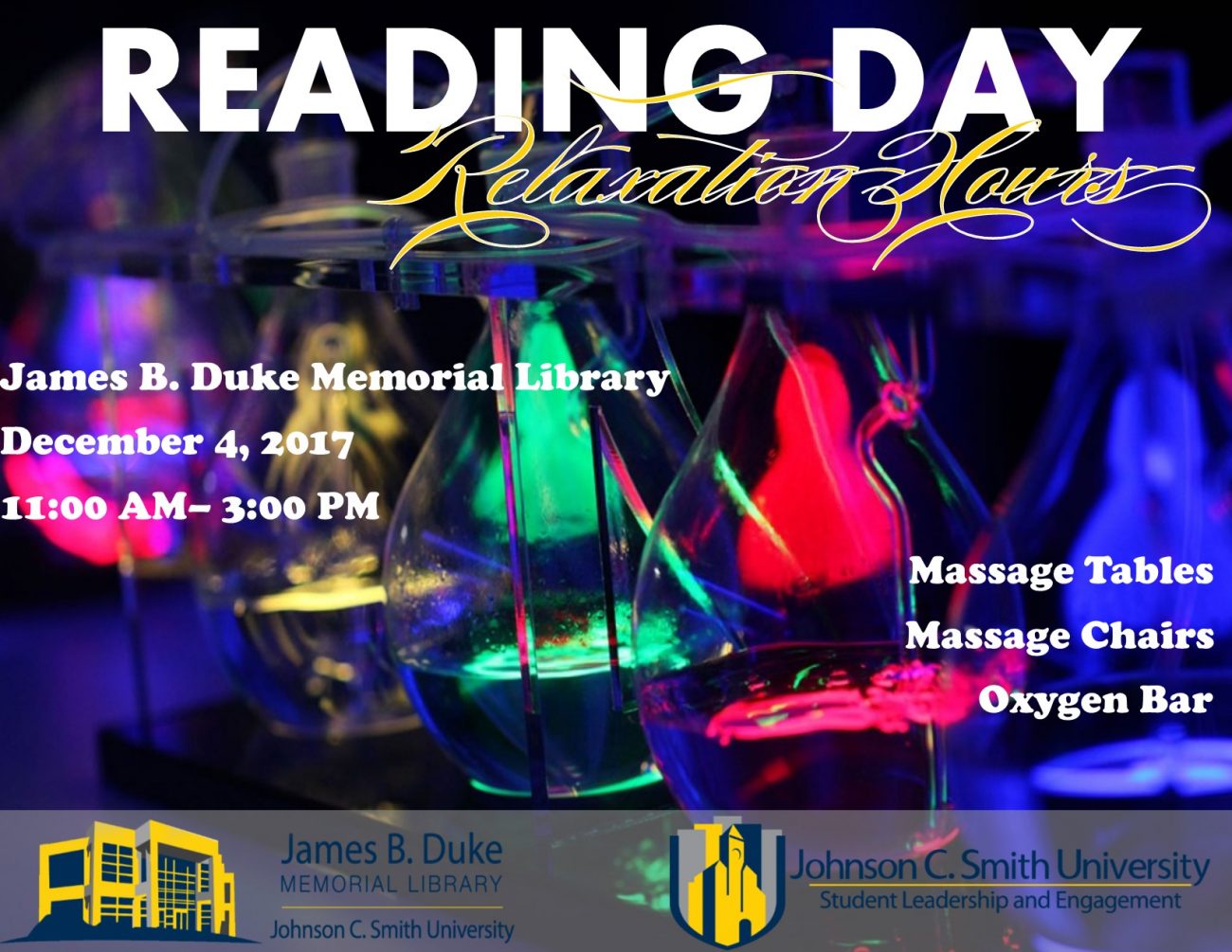 On Reading Day, Monday, December 4th Student Leadership and Engagement in collaboration with the James B. Duke Memorial Library is having Spintacular Entertainment come to campus to provide massage chairs and tables, and an oxygen bar. This event will provide an opportunity for students to have a moment to truly relax and unwind just before…