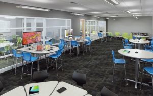 - A designated 527 sq ft space on the first floor of the library with 5 new computers, presentation TV screen, and whiteboards for collaboration.